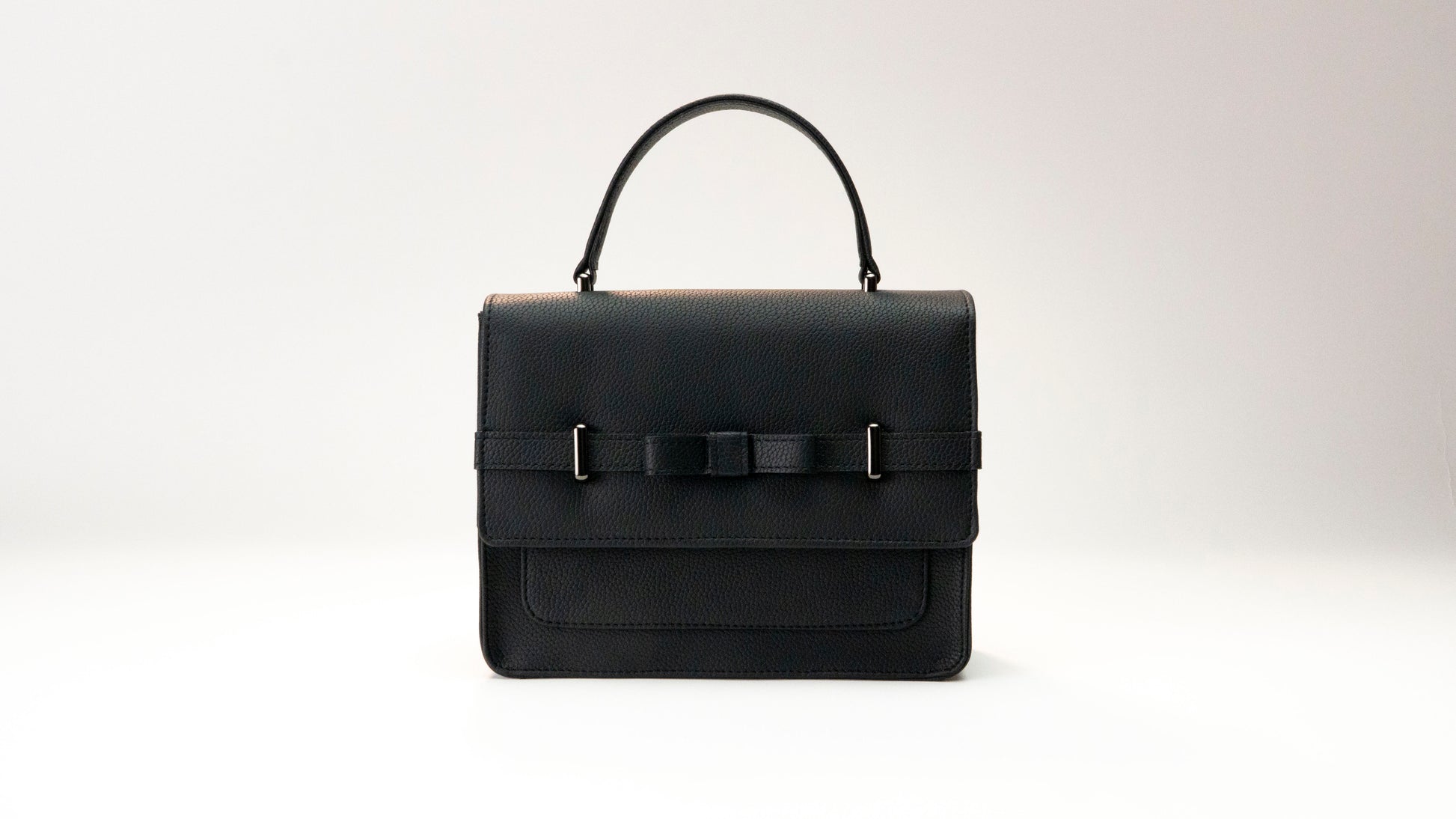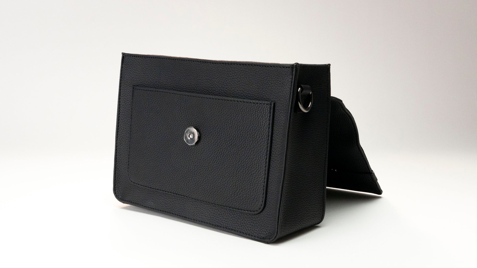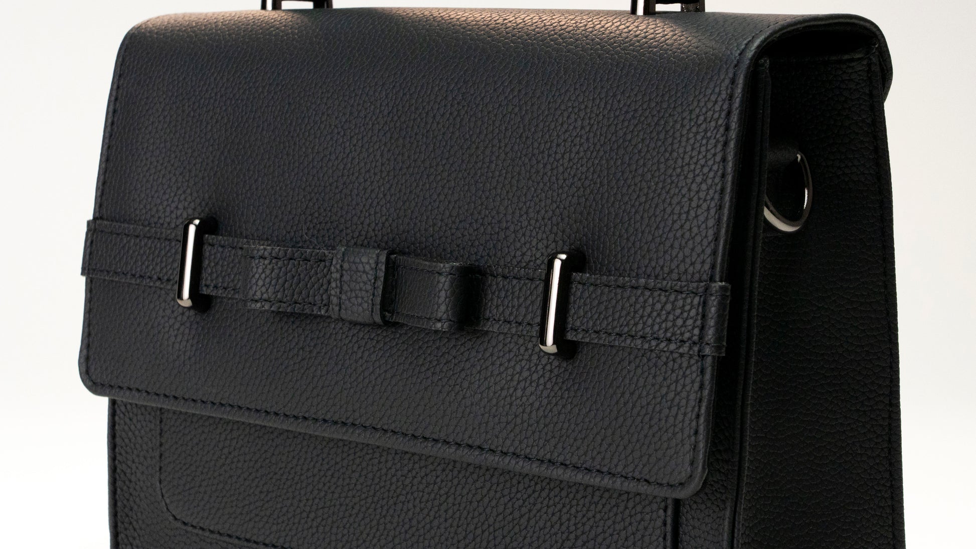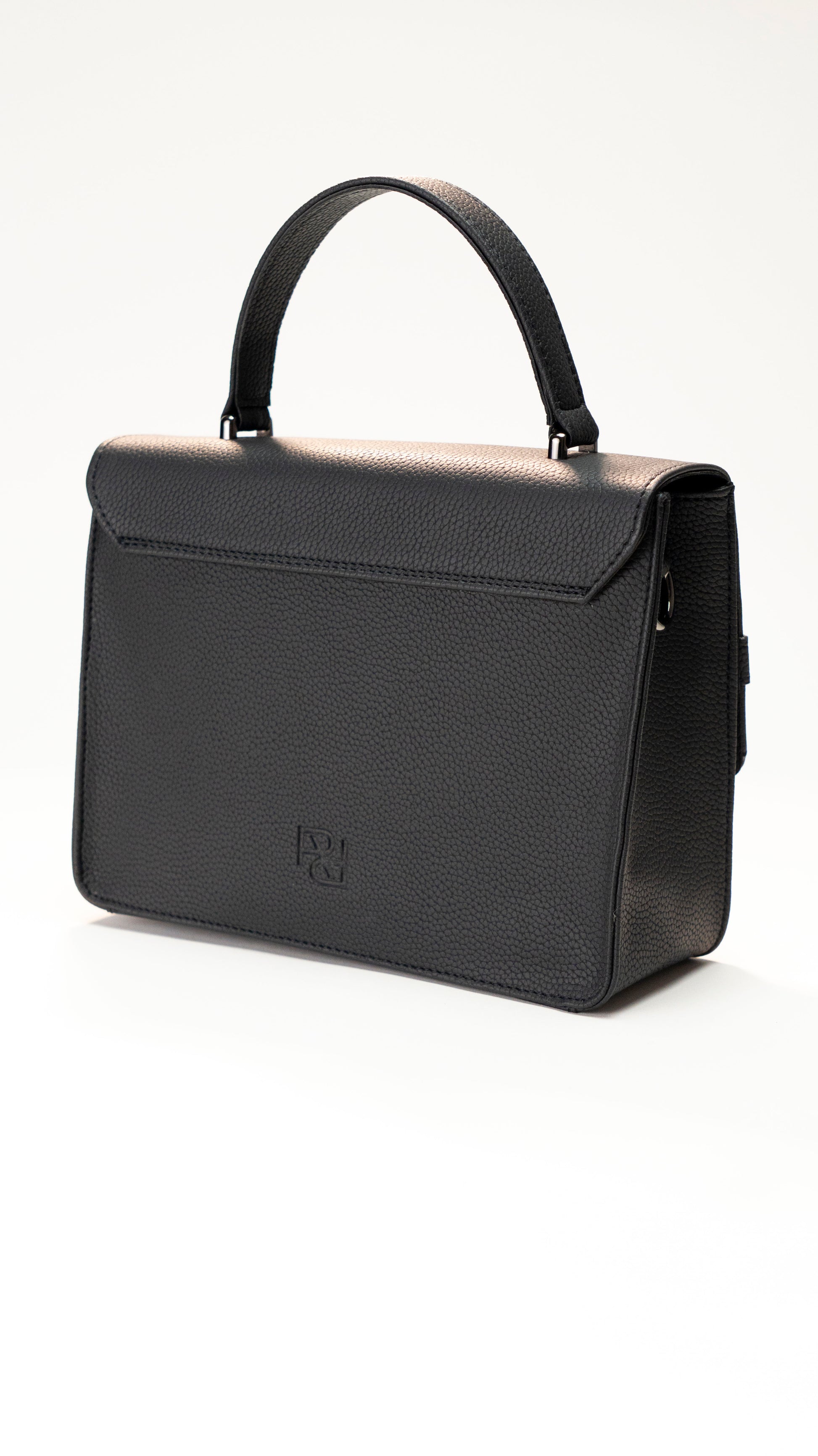 Bolsa artesanal estructurada en cuero vegano con textura granito, con silueta rectangular y tapa frontal amplia. Cuenta con un moño minimalista con herrajes negros, asa superior rígida y correa ajustable y removible. Incluye bolsa frontal, además de organizadores interiores para mantener todo en orden (bolsillo con cierre y compartimento para celular).. Laterales firmes y acabado totalmente forrado en negro. Sofisticada, moderna y perfecta para uso diario o eventos. 100% Mexicanas.